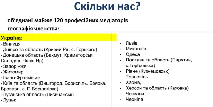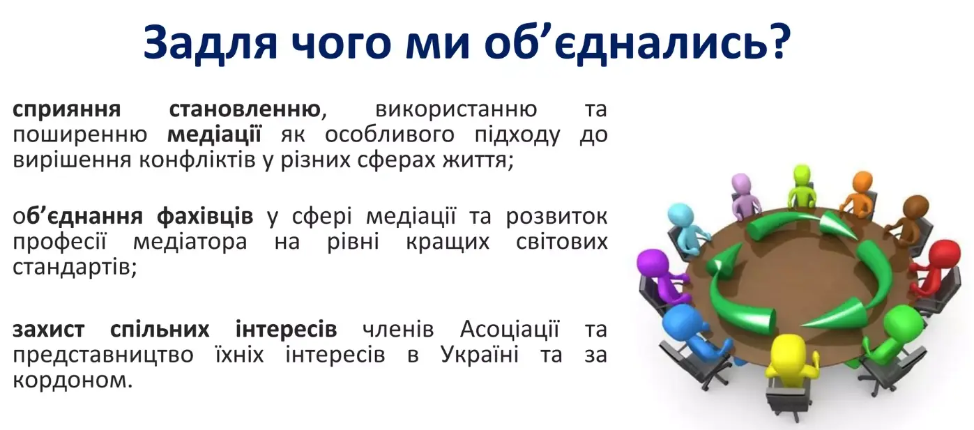 - Організація розробки та впровадження національних стандартів у сфері медіації.