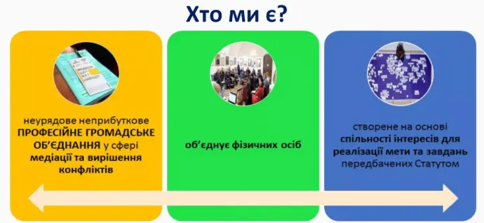 Асоціація є саморегуляторним, неприбутковим громадським об'єднанням фахівців, що працюють в сфері медіації.