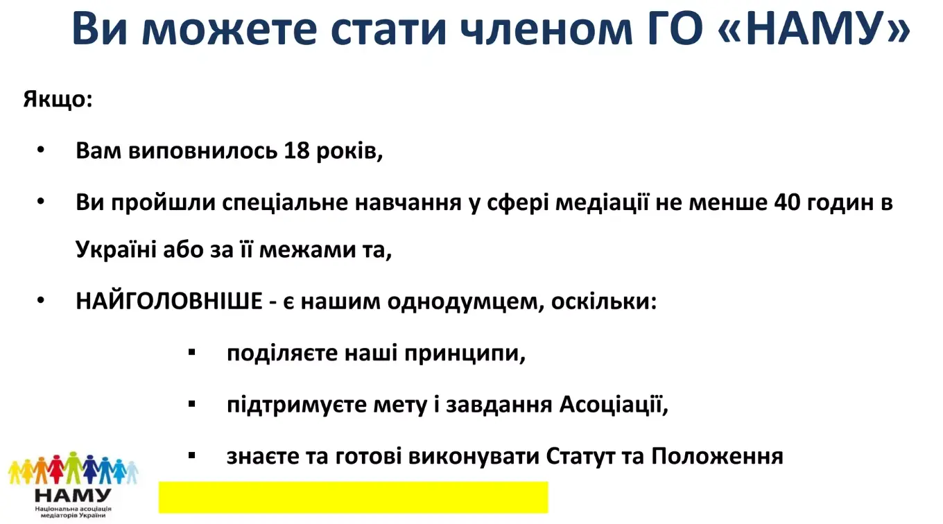 - Інформування громадськості та зацікавлених осіб про досягнення членів ГО «НАМУ» у сфері застосування практик медіації.