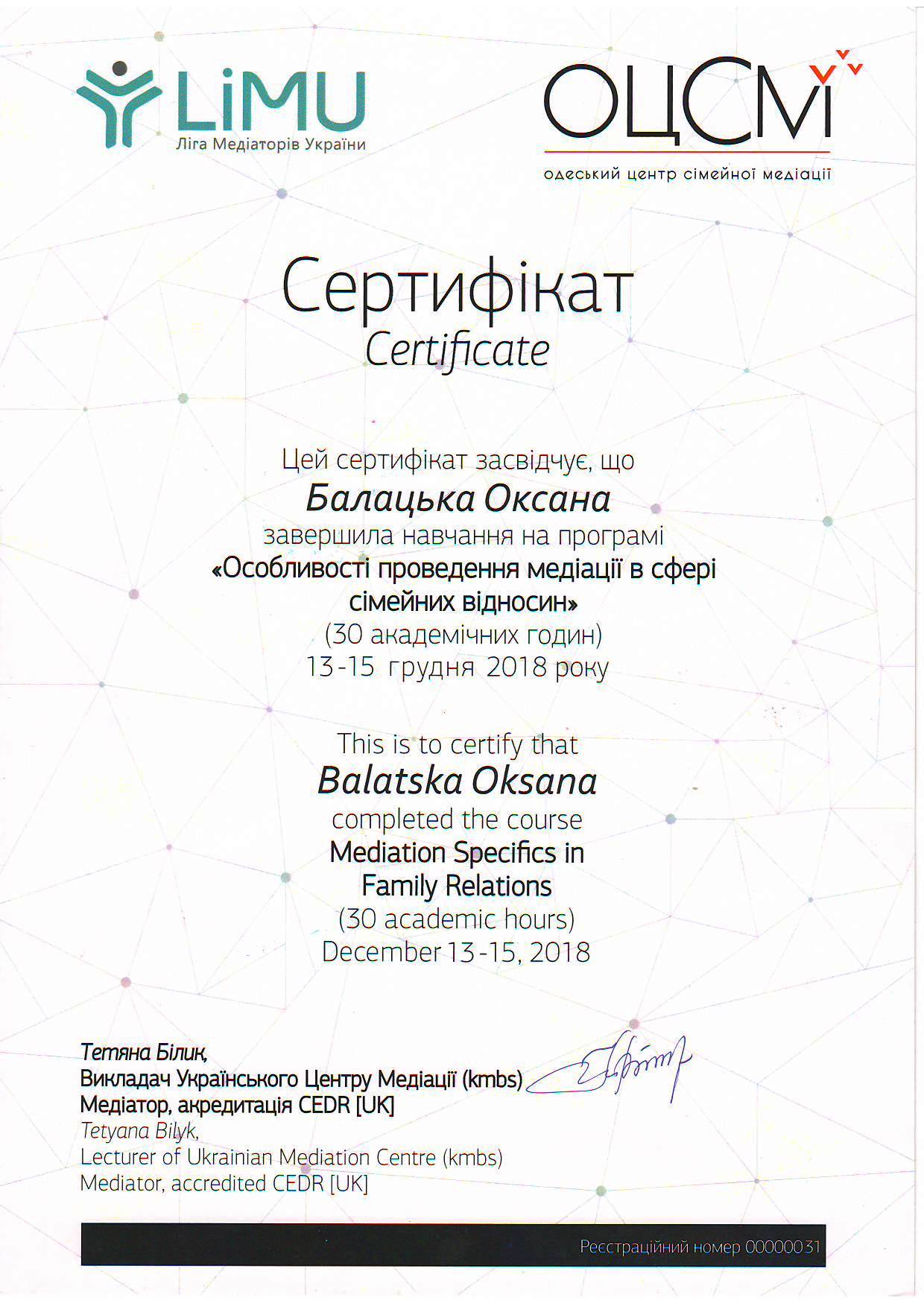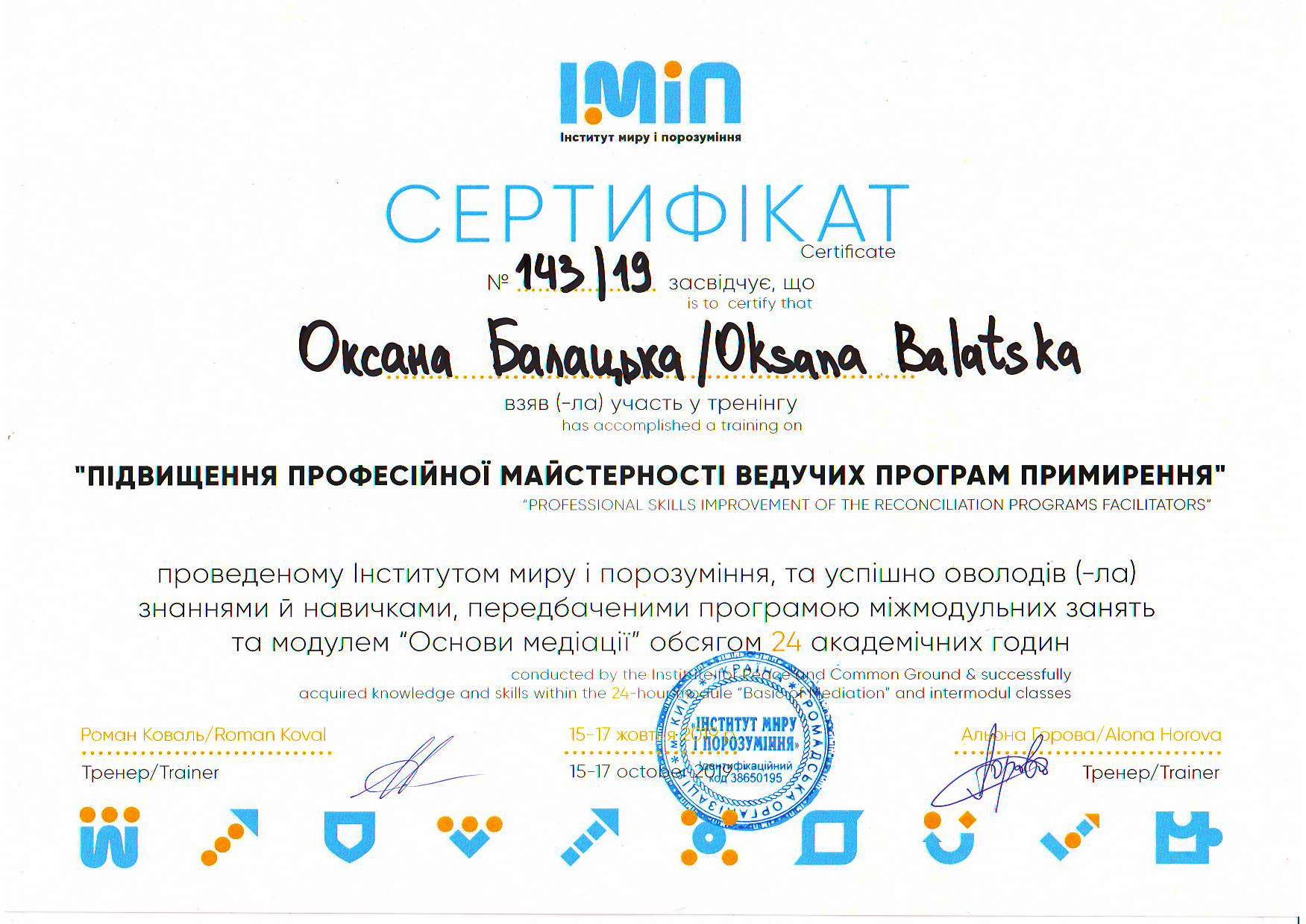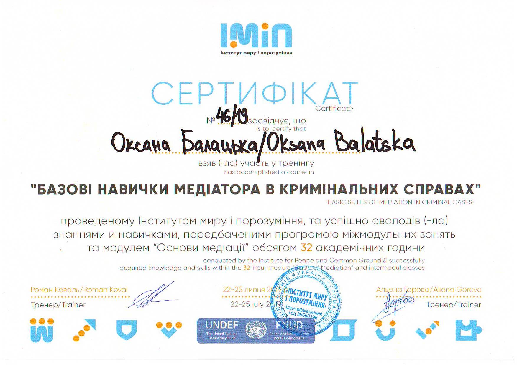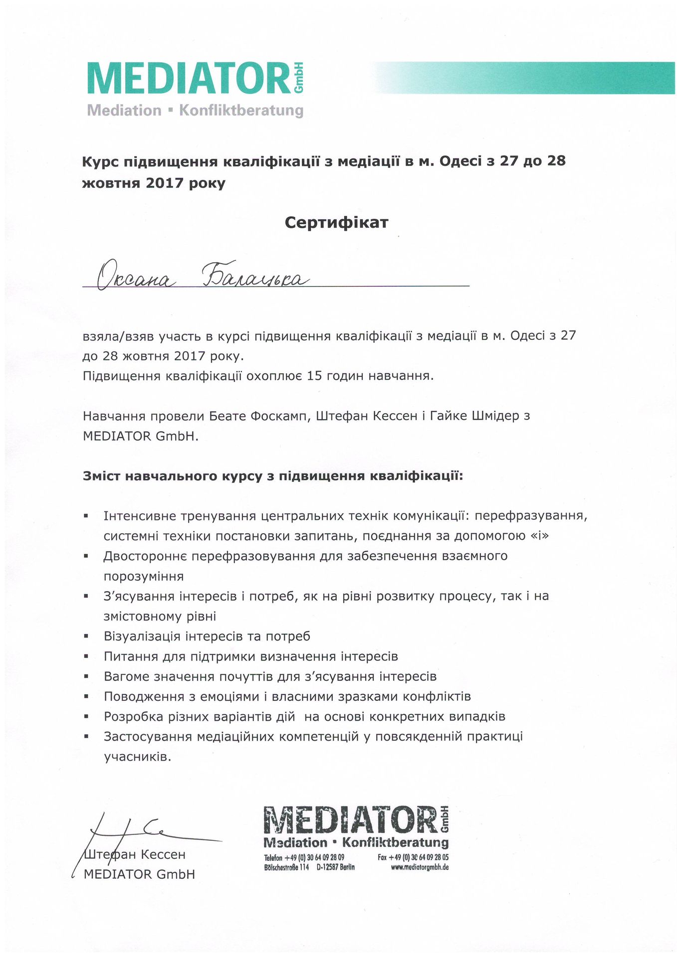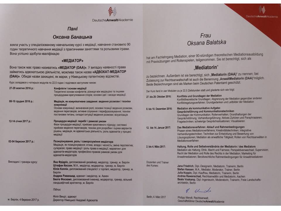 «Спеціалізований базовий курс» «Медіація для юристів» у рамках українсько-німецького проекту» Адвокат-медіатор