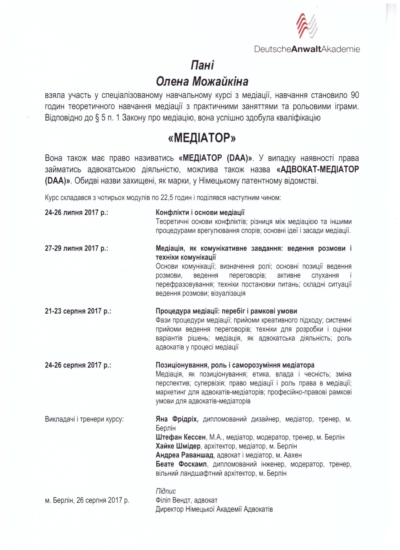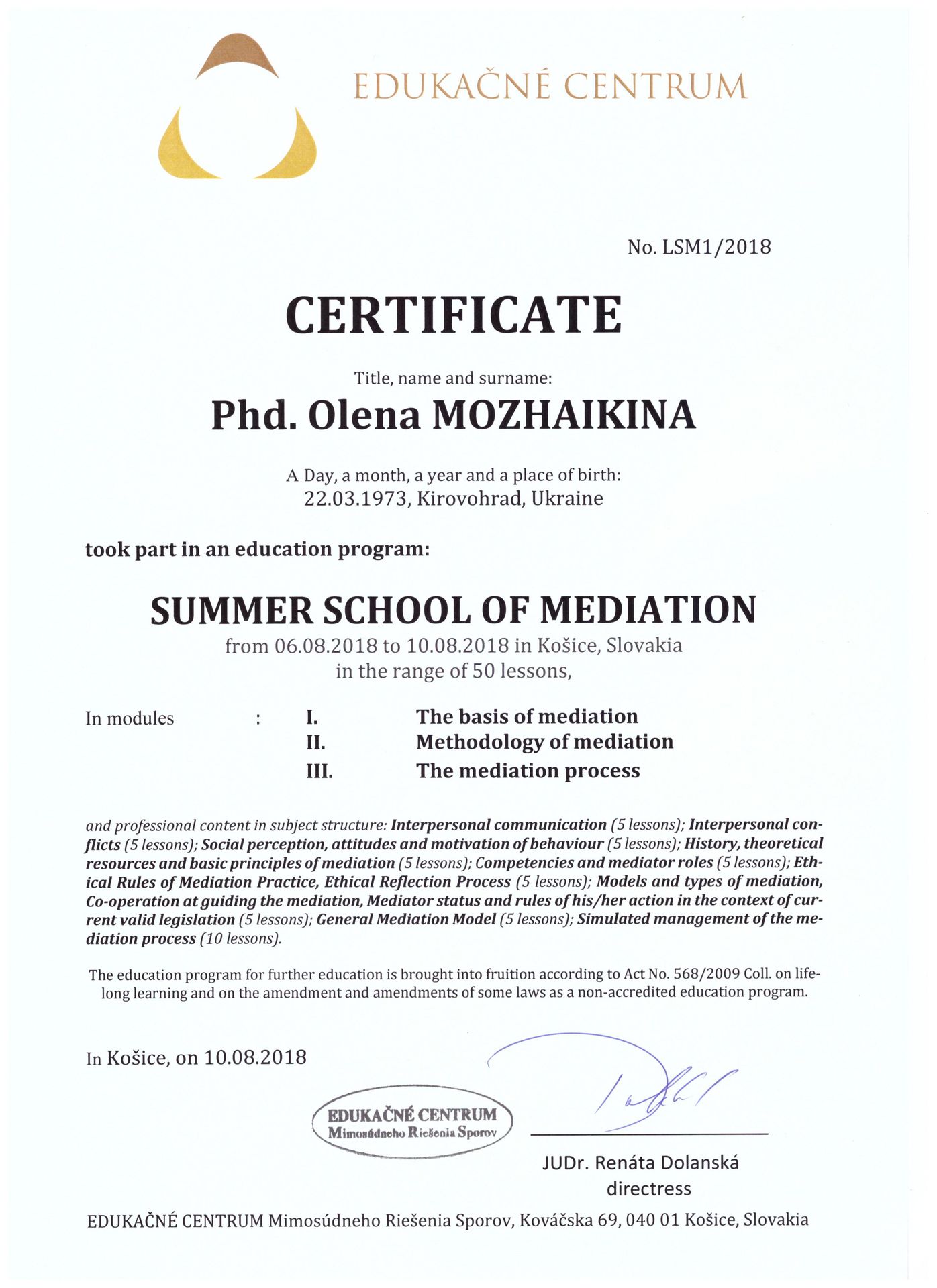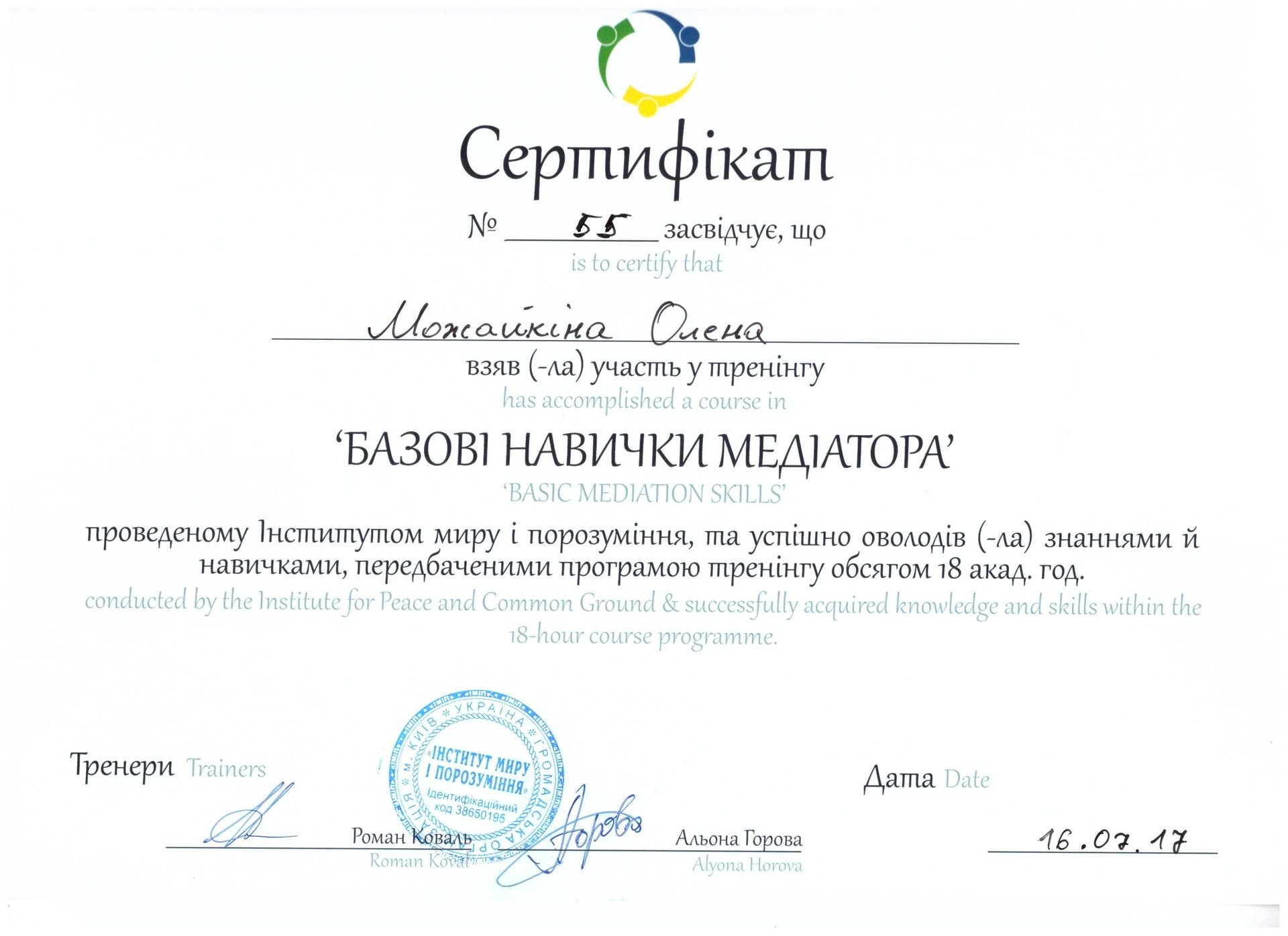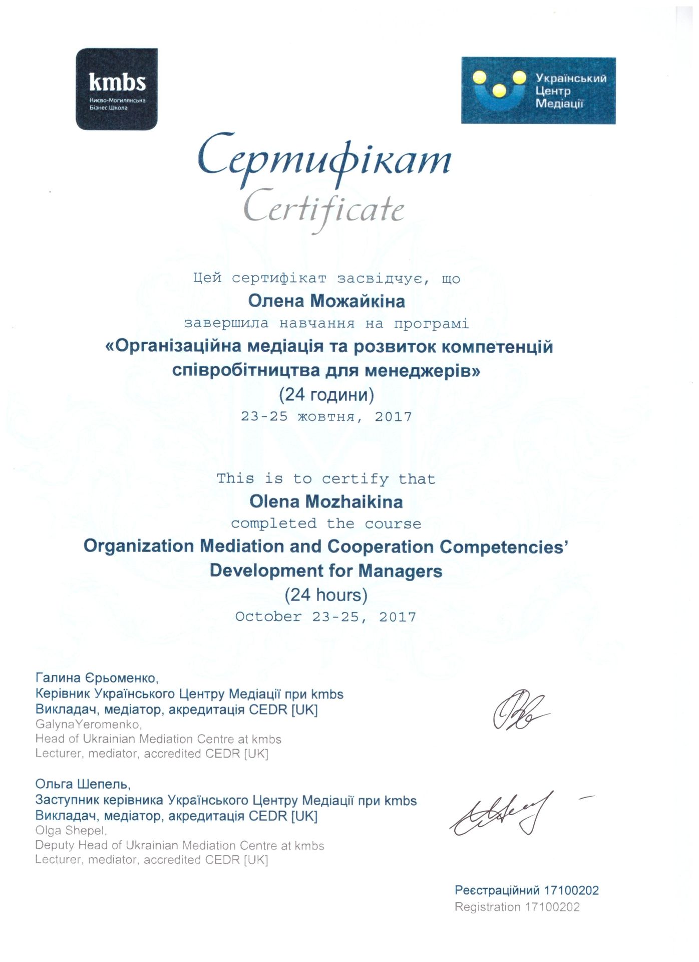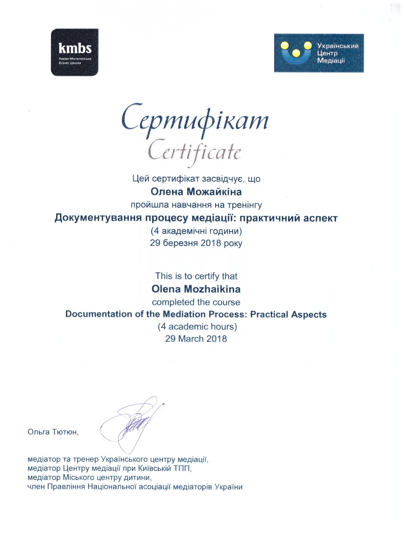 Можайкіна Олена Станіславівна, юрист, кандидат психологічних наук (спеціальність «Юридична психологія»), доцент кафедри міжнародного приватного, комерційного та цивільного права Київського національного торговельно-економічного університету, сертифікований медіатор, член Національної асоціації медіаторів України, член Всеукраїнської громадської організації "Асоціація правників України". Автор понад 60 наукових та навчальних праць з господарського та трудового права, кримінології, юридичної психології та медіації. Приймає участь у Всеукраїнських та Міжнародних наукових і практичних конференціях з метою популяризації та впровадження медіації в Україні. Спеціалізація: спадкові, корпоративні, трудові, комерційні, сімейні конфлікти; конфлікти в освітній сфері. Допомога в оцінюванні конфлікту, розмежуванні розбіжностей інтересів сторін, вирішенні суперечностей, пошуку взаємовигідних рішень. Медіація допомагає зберегти фінансові, часові, емоційні ресурси та налагодити міжособистісні відносини. Вступ до НАМУ зумовлений бажанням популяризувати медіацію в Україні; створювати освітні осередки та проекти з медіації; сприяти правовому регулюванню медіації в Україні.