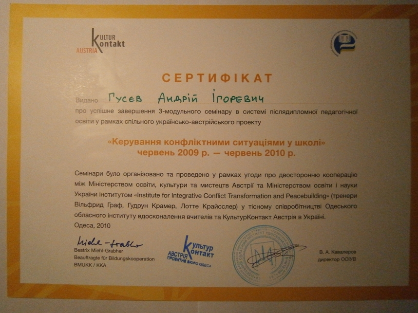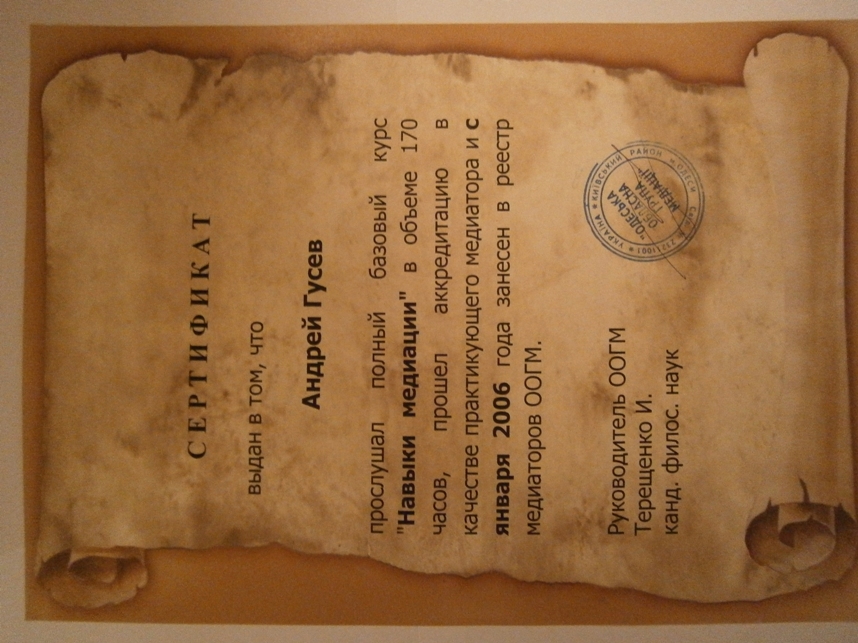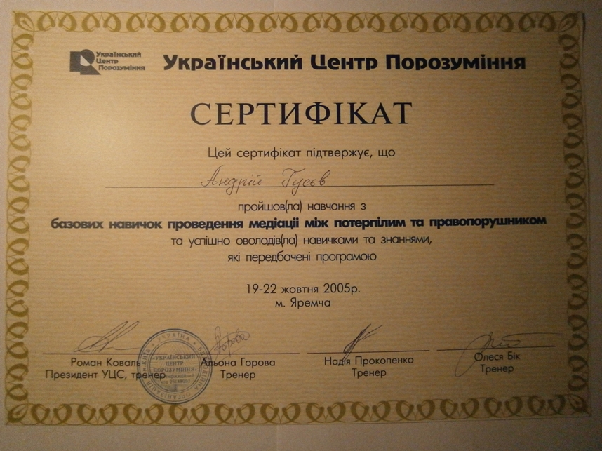 ГУСЄВ АНДРІЙ ІГОРЕВИЧ - практикуючий психолог, тренер, медіатор, кандидат психологічних наук, доцент кафедри психології та особистісного розвитку ДВНЗ Університет менеджменту освіти НАПН України (м. Київ). Керівник Київського філіалу Одеської обласної групи медіації (ООГМ), член правління ГО «Українська асоціація екологічної психологічної допомоги», член міжнародної Робочої групи з миротворчої освіти Глобального партнерства щодо запобігання збройних конфліктів GPPAC, член ГО «Національна Асоціація медіаторів України», член ГО «Одеська обласна група медіації» (ООГМ). З 2005 р. - тренер і медіатор в навчальних проектах Одеської обласної групи медіації (ООГМ). Досвід роботи з міжетнічними конфліктами в Киргизстані, Молдові, АР Крим та Одеській області в якості медіатора і тренера та експерта. З 2006 р. - Координатор, тренер, медіатор в проектах «Впровадження відновного правосуддя в роботу системи правоохоронних органів Півдня України» і «Впровадження відновного правосуддя в правову систему України», «Відновна соціальна трансформація». 2006-2009 р. - Розробник (у співавторстві) «Моделі громадського центру відновного правосуддя» та «Моделі програми медіації неповнолітніх потерпілих та правопорушників». 2010-13 р. Учасник експертної групи з розробки та експертизи проектів Закону України «Про медіацію». З 2012 р. - тренер з тематики практичної конфліктології, медіації (посередництва), розв’язання соціальних конфліктів, лідерства, розвитку толерантності та культури миру в проектах та навчальних програмах: Національного агентства України з питань державної служби та Школи вищого корпусу державної служби, чеської гуманітарної організації «Люди в біді», ОБСЄ, програми «МАТРА» Посольства Королівства Нідерландів в Україні, МБФ Карітас України, Українського католицького університету, UNHCR (The UN refugee Agency), Інституту з міжнародного співробітництва Асоціації народних університетів Німеччини (DVV International), ГО «Інформаційно-дослідний центр «Інтеграція та розвиток», Archer Daniels Midland Company ADM (США). У 2009 році захистив кандидатську дисертацію на тему «Толерантність до невизначеності як чинник розвитку ідентичності особистості». Автор 40 наукових статей з проблематики дослідження толерантності до невизначеності, медіації, особистісно орієнтованого навчання та психологічних аспектів впровадження відновного правосуддя. Співавтор 2 монографій та 7-ми навчально-методичних посібників. В тому числі: Ювенальна юстиція (2005), Особистісний потенціал: структура та діагностика (2011), Медіація в школі: український досвід впровадження (2013), Від співпраці до примирення: посібник для лідерів громадянського суспільства (2015), Аналіз конфлікту у бізнесі. Картографія (2016). Культура добросусідства: Я. Ми. Країна. (2016). Сприяння розвитку медіації