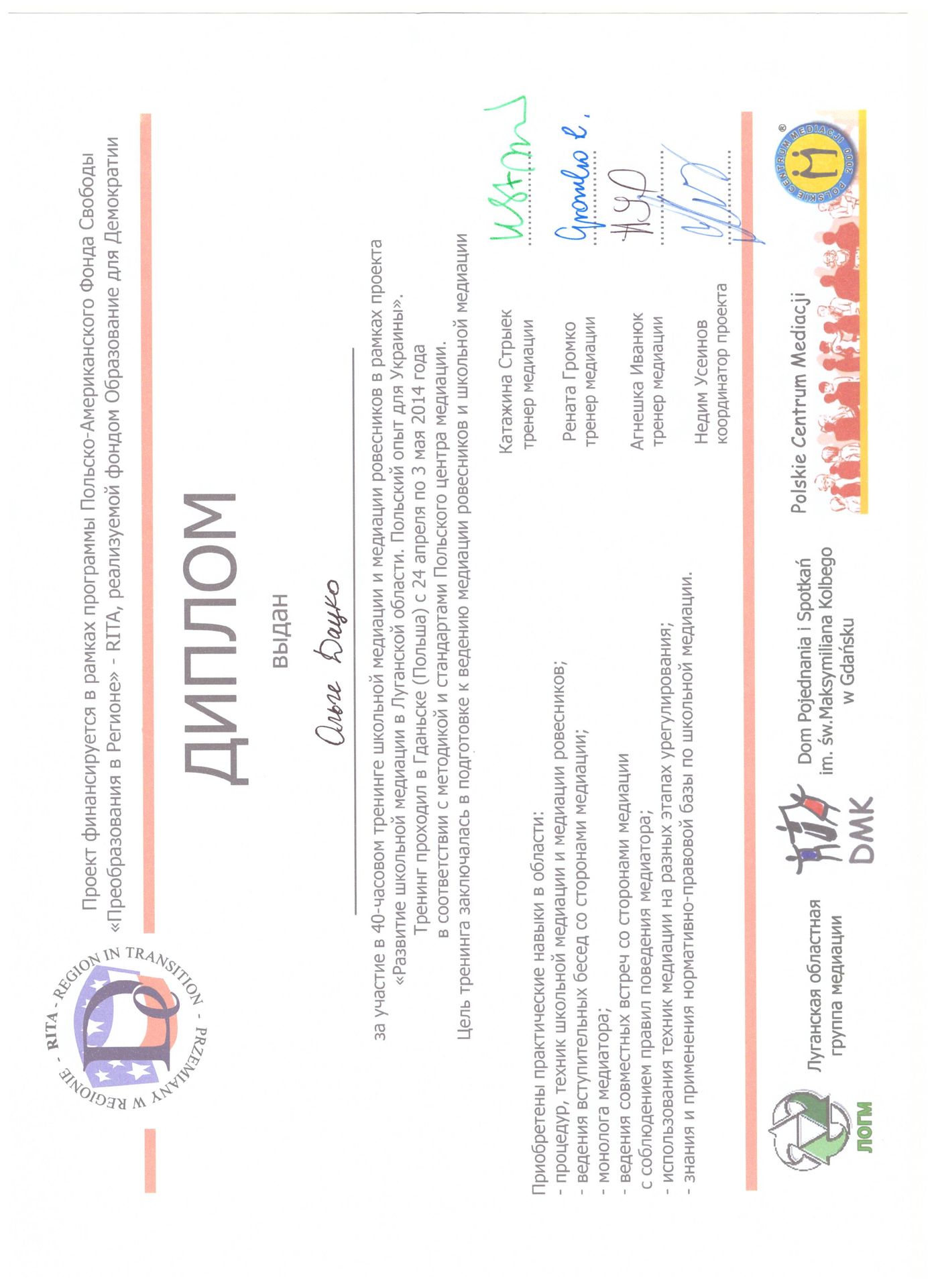 Займаюсь практикою медіації на навчанням з медіації та вирішення конфліктів з 1998 року. Спеціалізація - сімейна медіація та медіація у школі, вирішення кнфліктів в організаціях та поліпшення організаційної культури. З 2014 року вивчаю та практикую ненасильницьку комунікацію. Надаю послуги організаціям з ефективної комунікації, налагодження та покращення соціально-психологічного клімату в організації, побудові зв'язків між співробітниками/підроздлами організації на засадах відкритості, довіри, побудові емпатії та задоволення потреб. Допомагаю налагоджувати розірвані зв'язки у громадах, організаціях та сім'ях внаслідок конфлітктів. Сприяти просуванню якісних послуг з медіації, поширювати культуру ефективного спілкування, конструктивного вирішення конфліктів