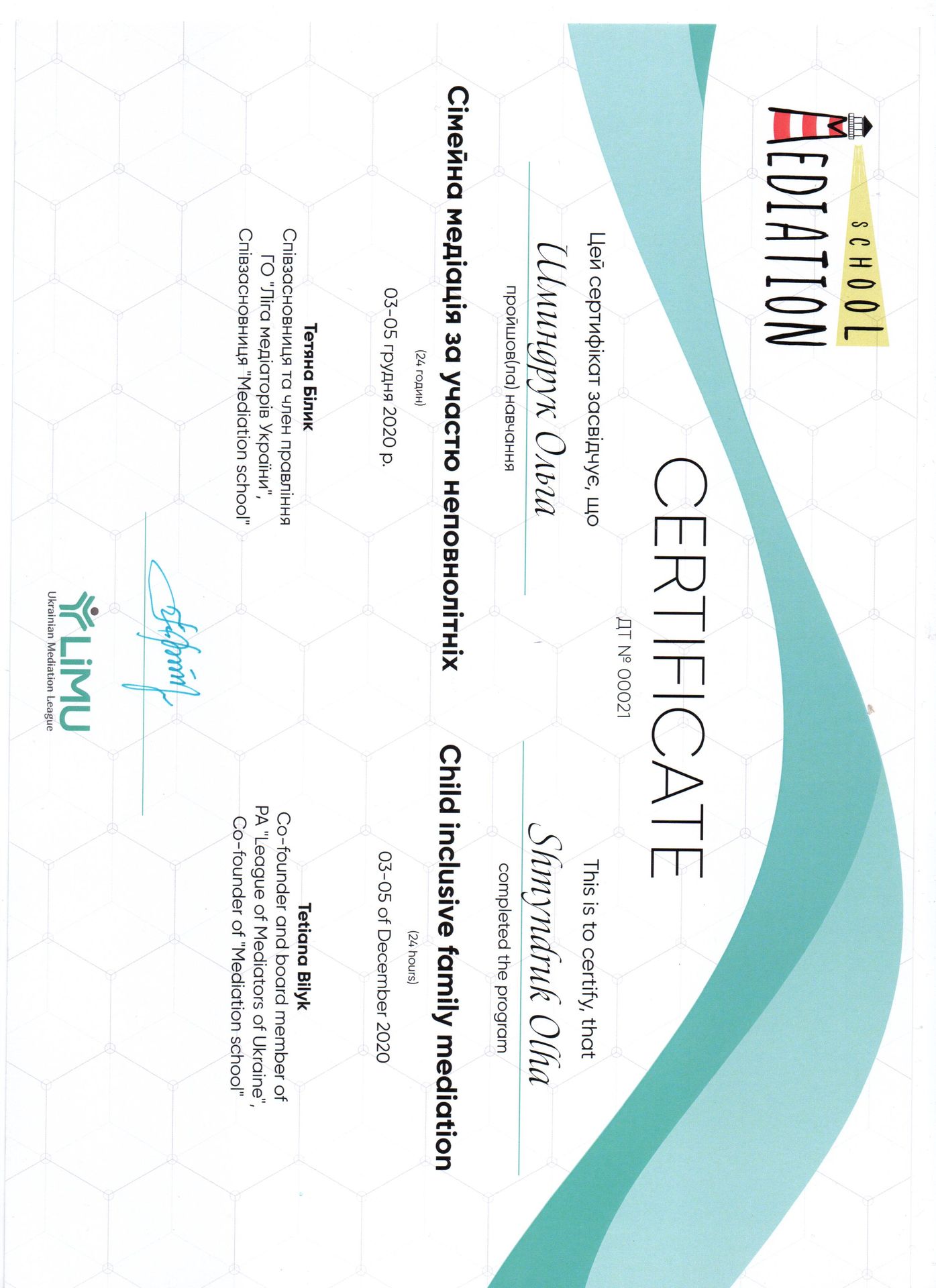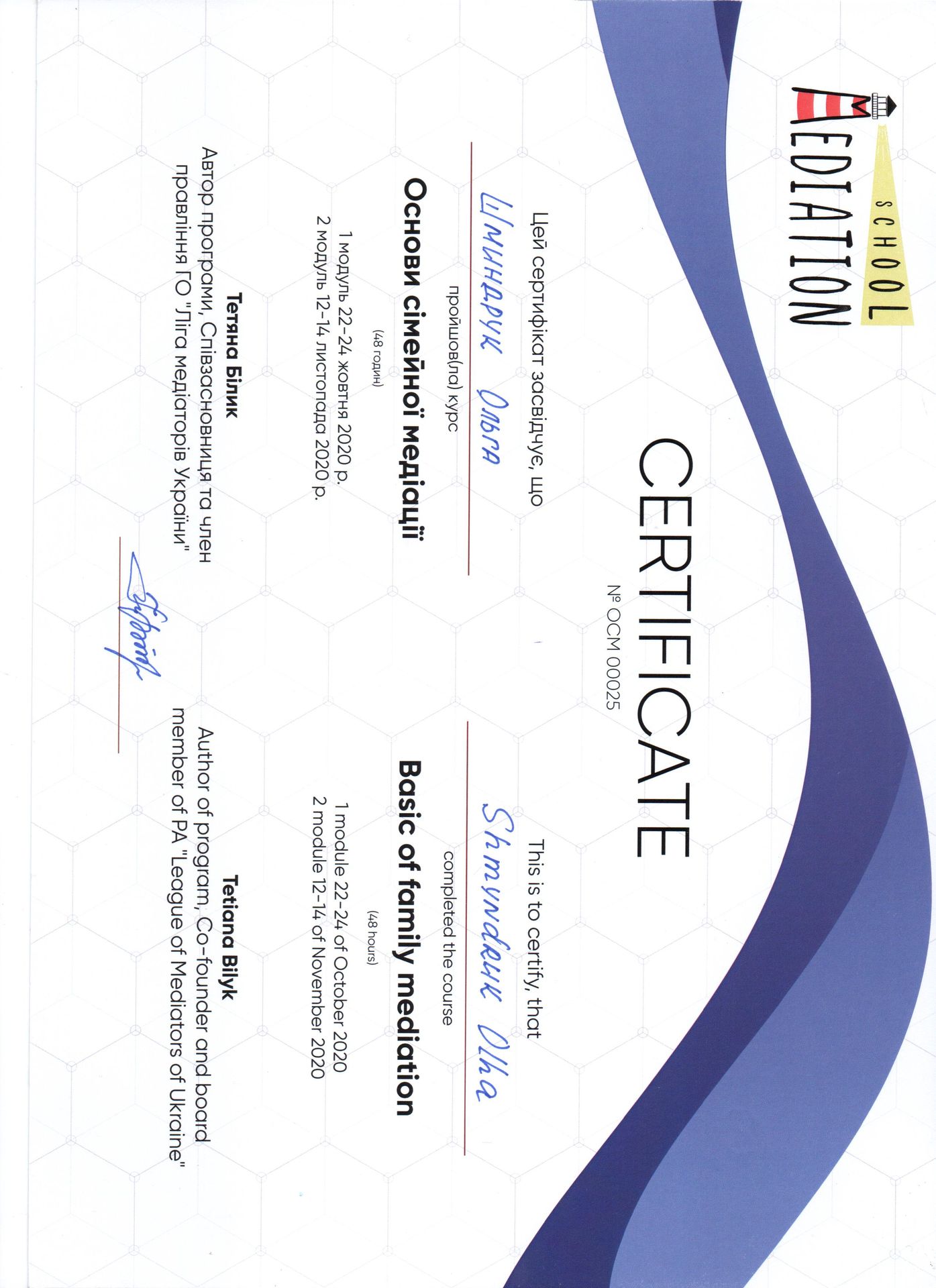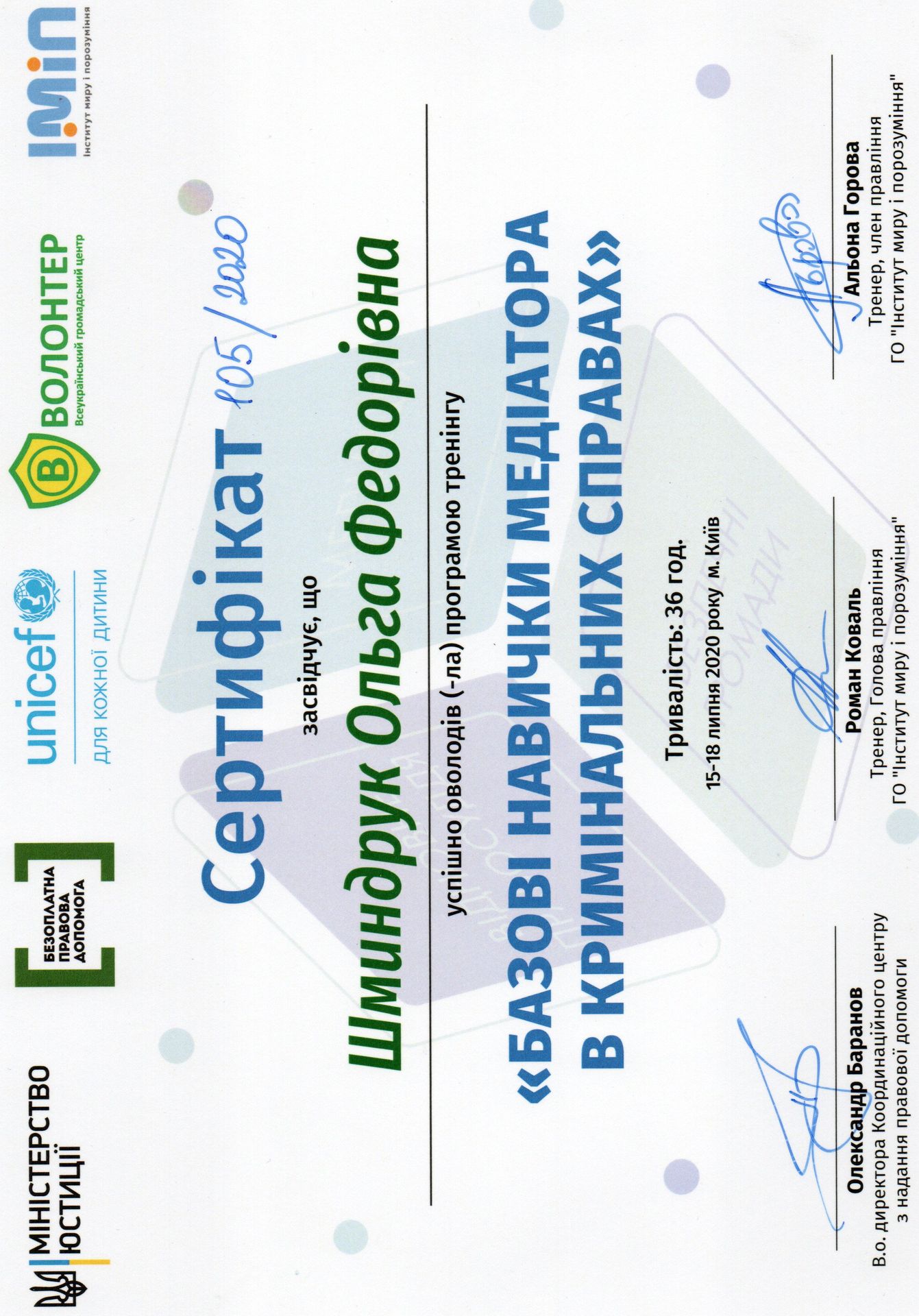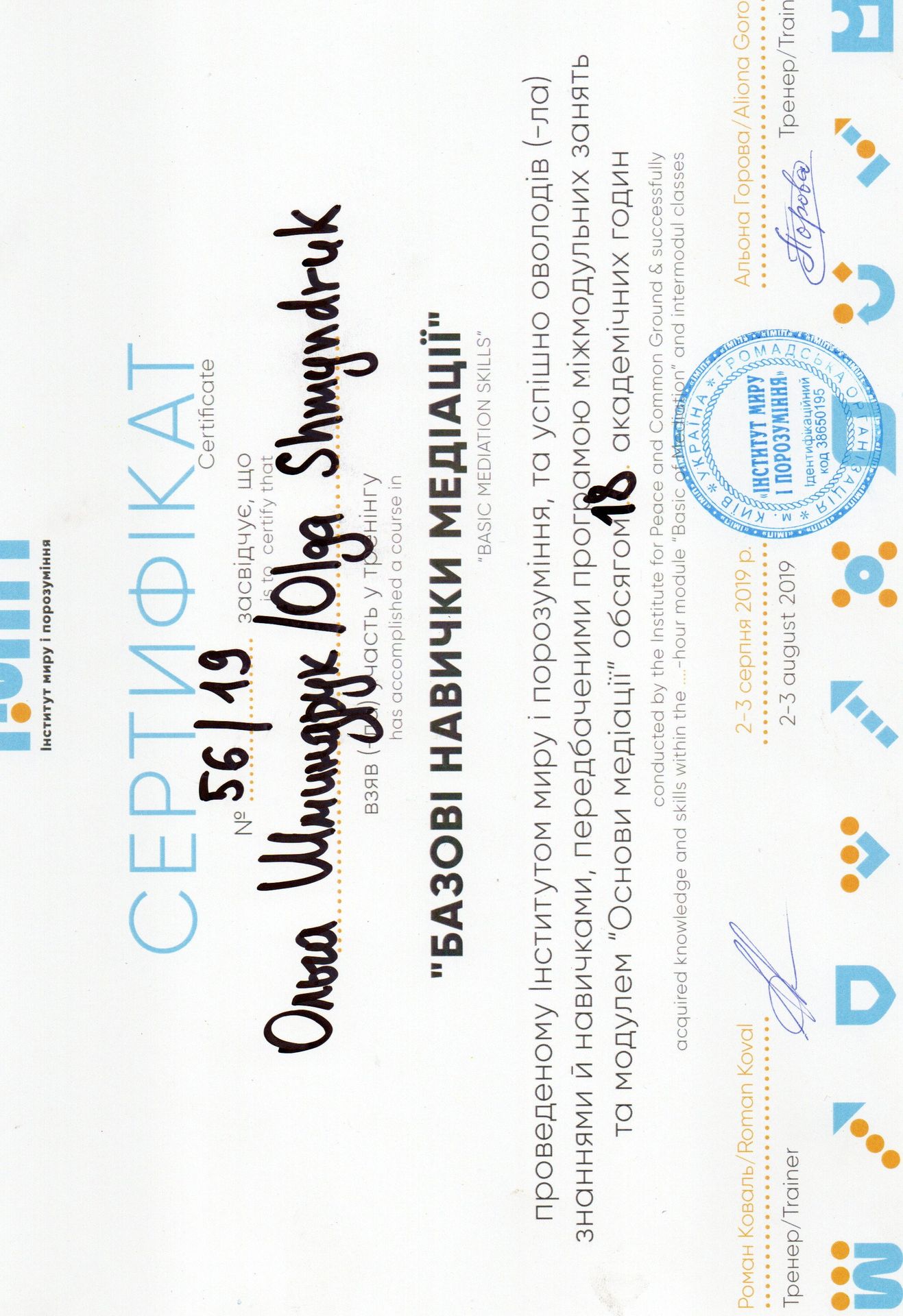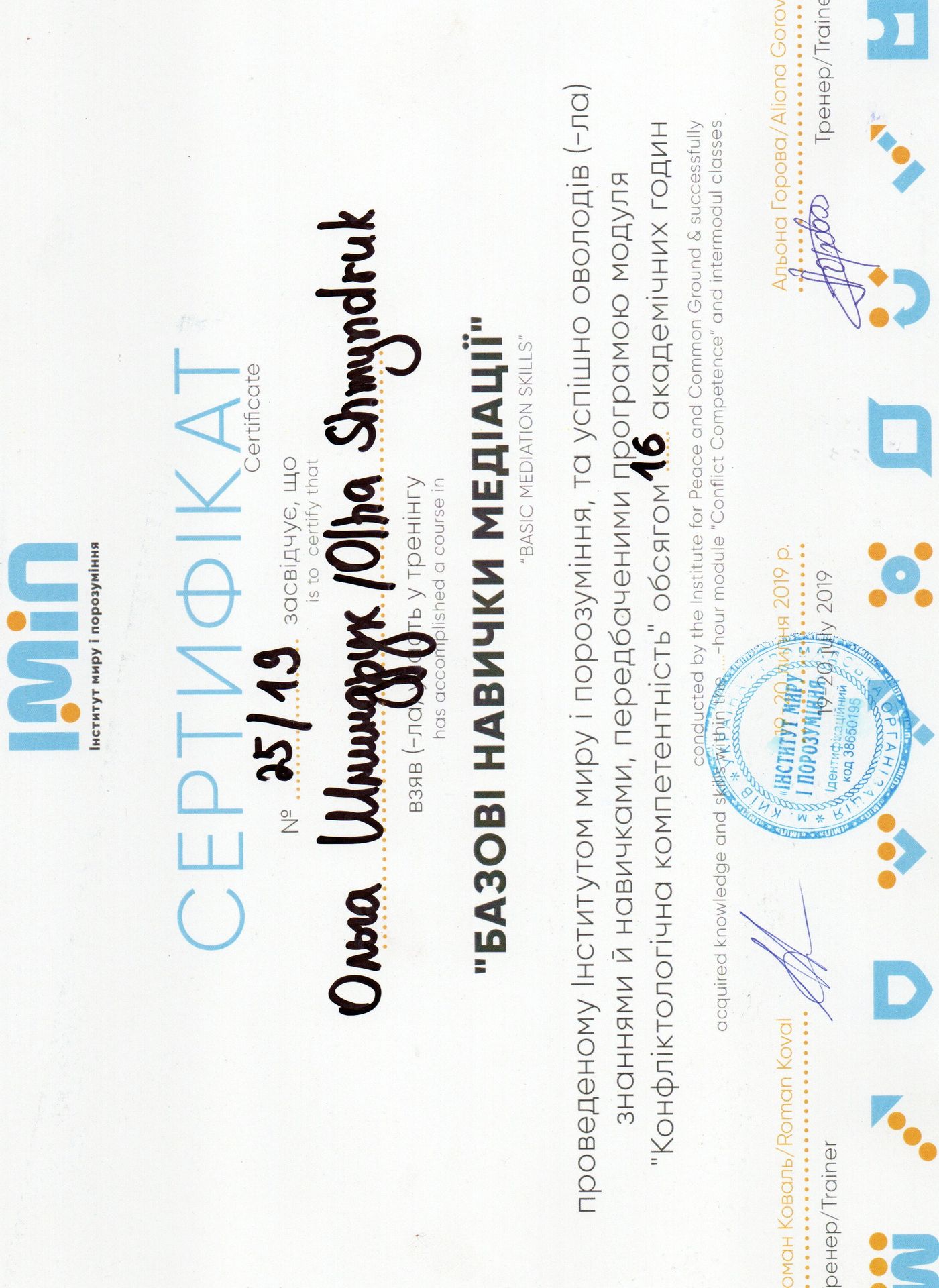 Адвокат, кандидат юридичних наук. Більше 11 років адвокатської практики в цивільних, кримінальних, адміністративних та господарських справах. Пріоритетом моєї професійної діяльності є задоволення інтересів клієнтів. Свої завдання як медіатора бачу у вмінні допомогти сторонам почути один одного, усвідомити свої потреби та інтереси та знайти спільний шлях вирішення спору. Метою для вступу до членів НАМУ є: - розширення клієнтської бази; - комунікація з колегами-медіаторами; - участь у актуальних заходах, присвячених медіації; - обмін власним досвідом та отримання нового; - участь в проектах, присвячених розвитку медіації в Україні