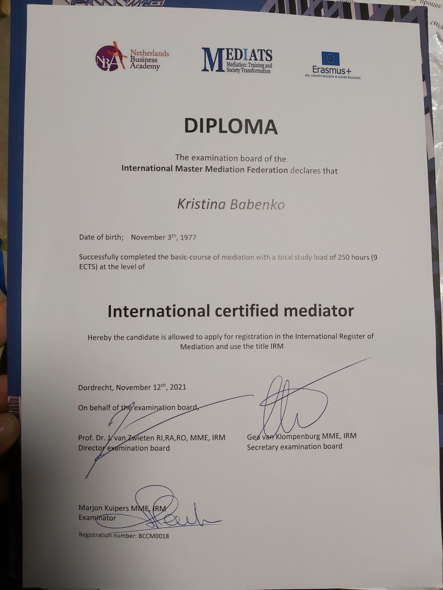 Я днями отримала диплом сертифікованого міжнародного медіатора та менш як за місяць отримаю диплом з ОП медіація від ХНУ ім.В.Н.Каразіна. Я хочу, щоб ці дипломи не були черговими папірцями у теці. Тепер, коли Закон про Медіацію прийнятий, моє рішення зумовлене не лише бажанням реалізуватися у професії, але й бажанням зробити те, що в моїх силах для поширення обізнаності та популяризації медіації і Україні.