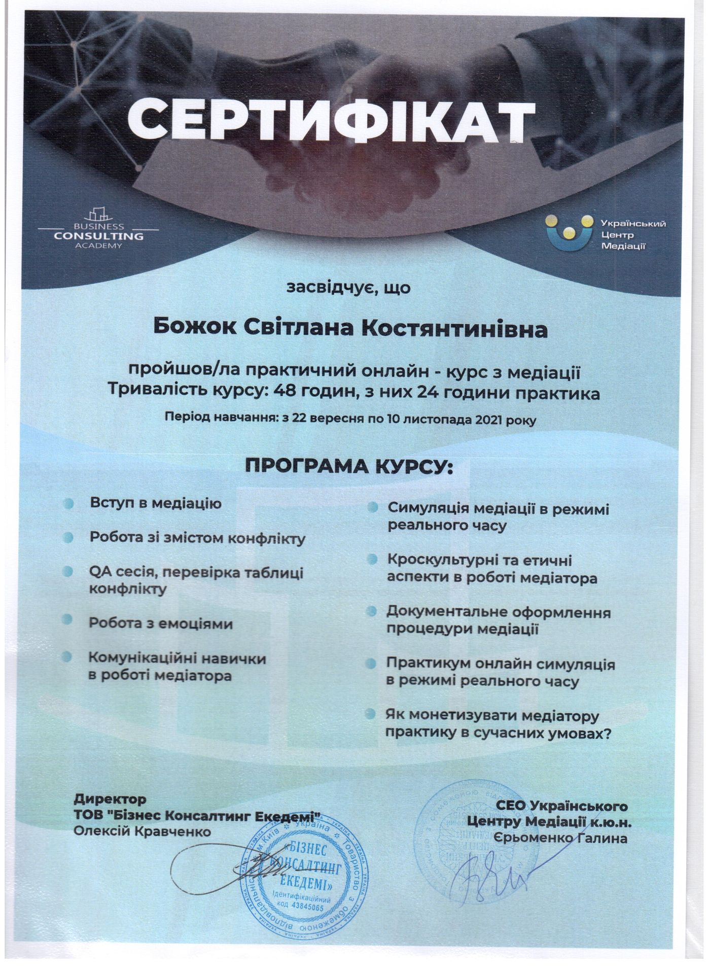 За факом - юрист, державний службовець, 22 юридичного стажу. Наразі ГО "НАМУ" веде активну роботу щодо використання та поширення медіації як ефективного вирішення конфліктів у різних сферах життя, розвитку професії медіатора. Для мене стати членом ГО "НАМУ" - це стати частиною сильної команди, спроможної сприяти встановленню та поширенню медіації в Україні, надавати якісну медіацію, що є передумовою широкого застосування альтернативних, ефективних способів вирішення спорів та конфліктів в Україні. За факом я - юрист, з багаторічним досвідом роботи, але глибоко переконана, що медіація є ефективним методом врегулювання спору шляхом переговорів сторін спору за допомогою медіатора.