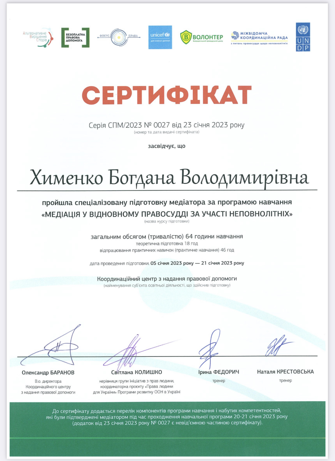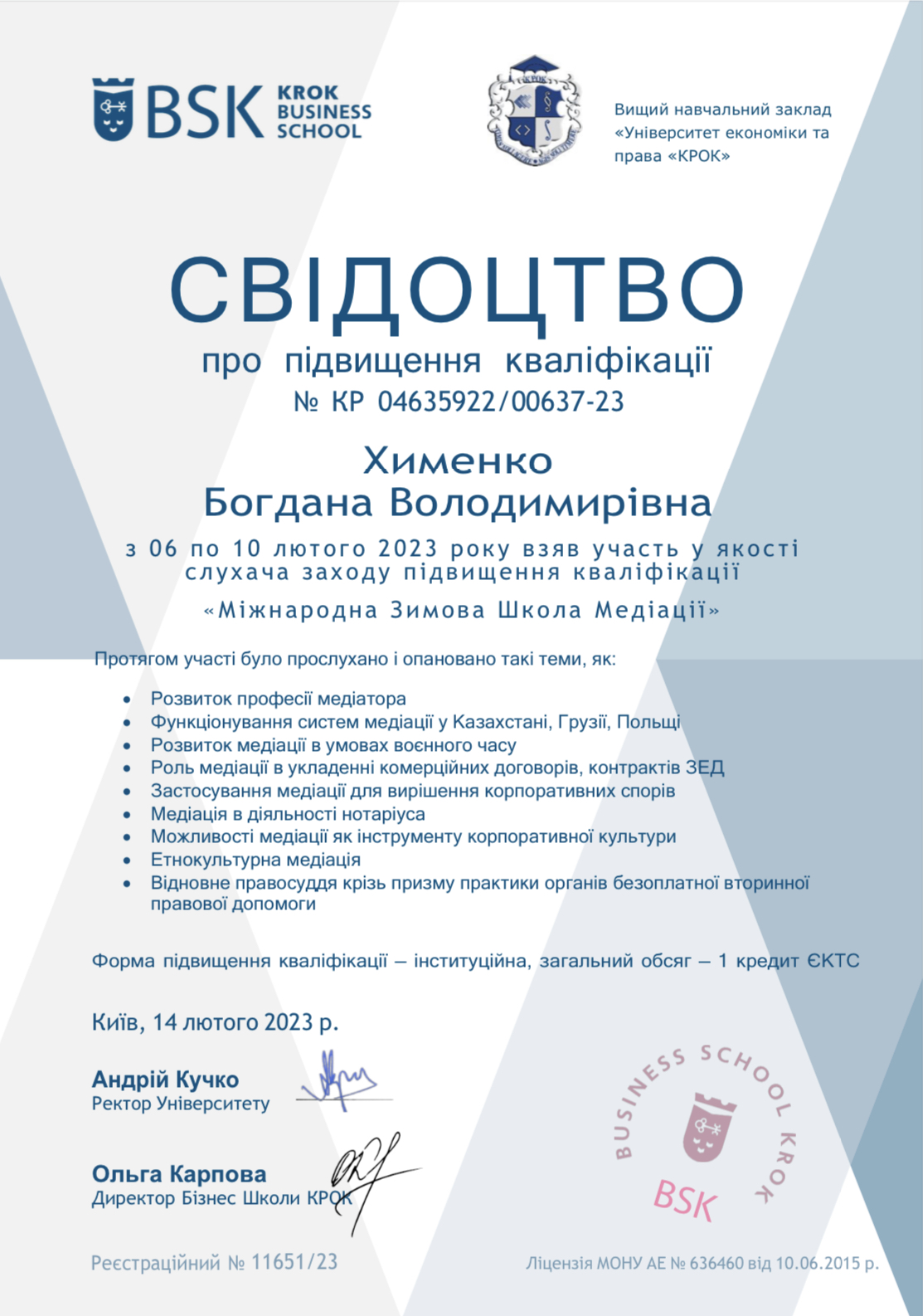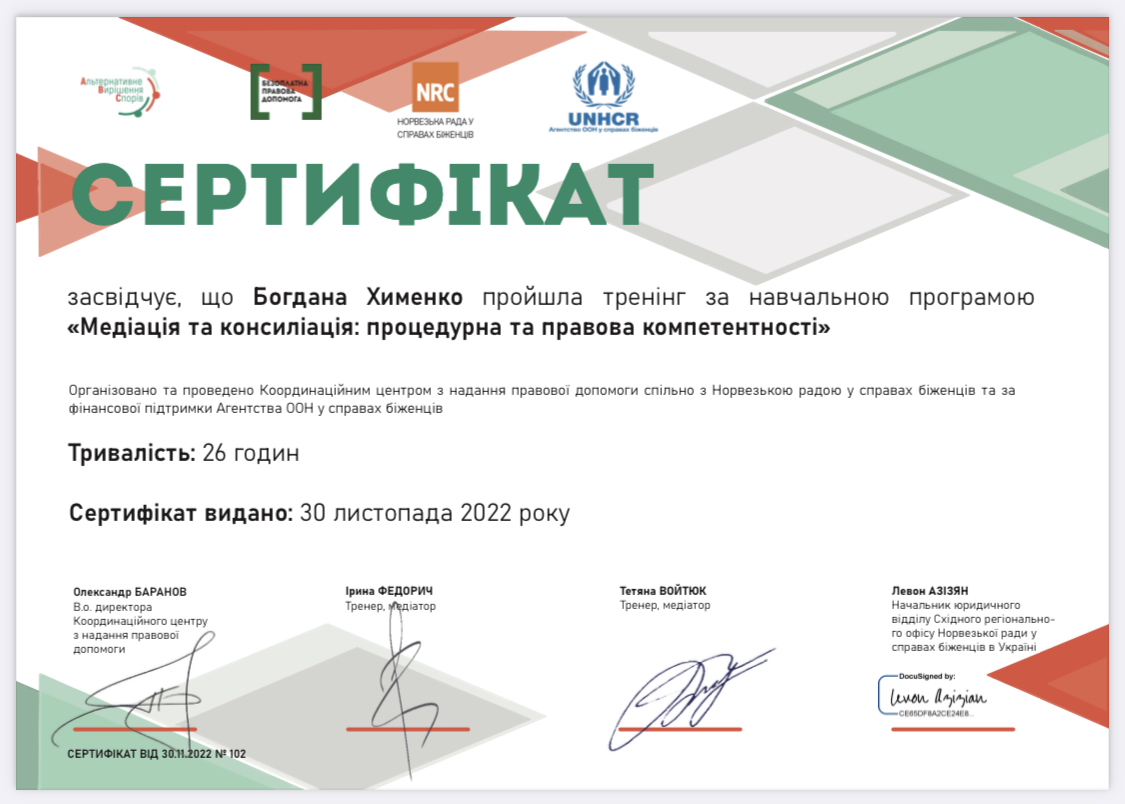 Досвідчений юрист та адвокат з економічною освітою та досвідом роботи, як внутрішнім юристом на найбільших в Україні підприємствах, так і в топовій юридичній консалтинговій компанії, де курувала напрямок господарських та корпоративних спорів. В роботі використовую техніки когнітивно-поведінкової терапії та коучингу. Так як навчалась в УЦМ, вважаю НАМУ еталоном самоврядування медіаторів. Хотілось би долучитись до спільноти професіоналів, з якими спільно вести просвітницьку діяльність щодо медіації (зараз займаюсь цим сама у себе в блозі instagram.com/bohdanakhymenko), ділитись досвідом, здійснювати та отримувати супервізію та інтервізію.