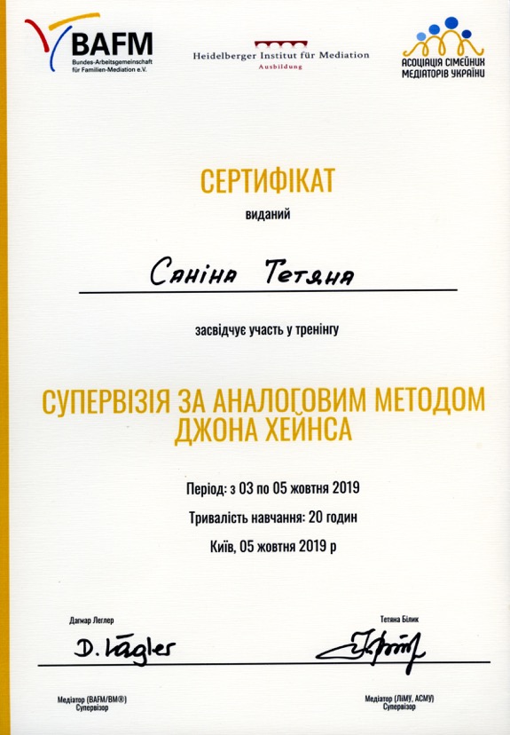 Закінчила магістеріум та аспірантуру Національного університету "Києво-Могилянська академія" за спеціальністю соціологія. Нині тренерка, авторка науково-популярних статей та двох романів, дослідниця практик дитинства, старша викладачка кафедри соціології НаУКМА, продюсерка кіно- та відеопроектів, сімейна медіаторка, супервізорка медіаторів, співзасновниця і керівниця ГО Чародім. Саніна Тетяна 22.02.2002