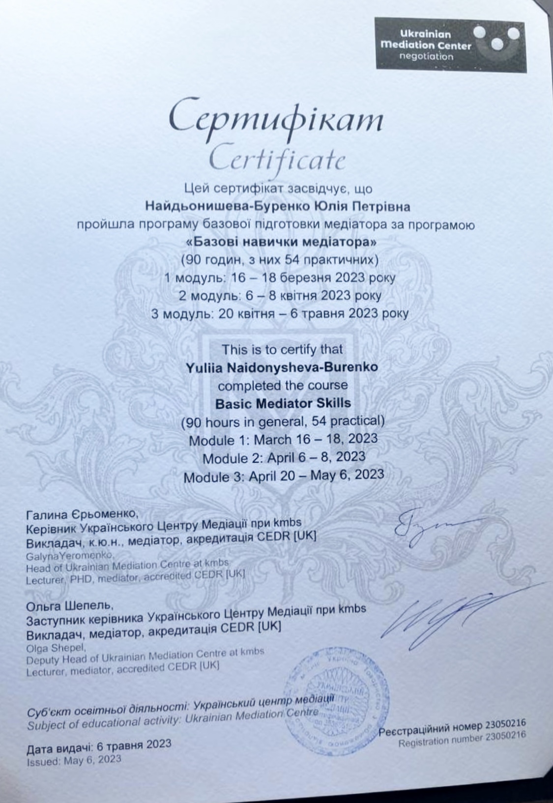 2011 році закінчила національну Академію внутрішніх справ, спеціальність правознавство. факультет права та підприємництва. Працювала завжди за спеціальністю юристом в приватній сфері, потім на державних посадах теж за спеціальністю. З 2011 року і до тепер працювала у сфері державної реєстрації нерухомості та бізнесу. З 2017 р. займала керівну посаду відділу державної реєстрації нерухомості та місця проживанням. Займалась навчанням реєстрів нотаріальну спільноту. У 2022 році закінчила національну Академію управління при Президенті України, маю спеціалізацію магістра магістр публічного управління та адмініструваннязі. Зі школи вивчала німецьку мову, під час війни проживала за кордоном та удосконалила вивчення німецької мови, маю закордонний сертифікат з рівнем А2. Сферою медіації вирішила зайнятися, оскільки хочу більш широко опанувати дану сферо, перейняти досвід наставників та стати гідним фахівцем сфери медіації. Подобається допомагати людям а особливо завжди мали схильність до психології. В мене в даній сфері на сьогодні поки що немає кейсів, але маю надію скоро знайти. Достеменно добре вивчала курс Базові навички медіатора дуже хочу співпрацювати з Асоціацією та бути корисною. З повагою Юлія Моя мотивація вступити до НАМУ зумовлена тим, що маю можливість ділитися досвідом з колегами з питань нерухомості та бізесу під час вирішення кейсів з нерухомості. Переконана, що такі знання можуть бути цінними для колег. Можу надати підтримку над роботою нових проектів. Згодом можу бути лектором (можливо з питаннями зі своєї сфери нурухомості (маю такі думки)). Від НАМУ маю надію отримати підтримку в своєму розвитку, в частині розробки можливо моїх нових проектів для навчання медіаторів. Та підтримку зорієнтуватися як правильно рухатися для початку кар'єри , як ментора для майбутніх медіаторів.