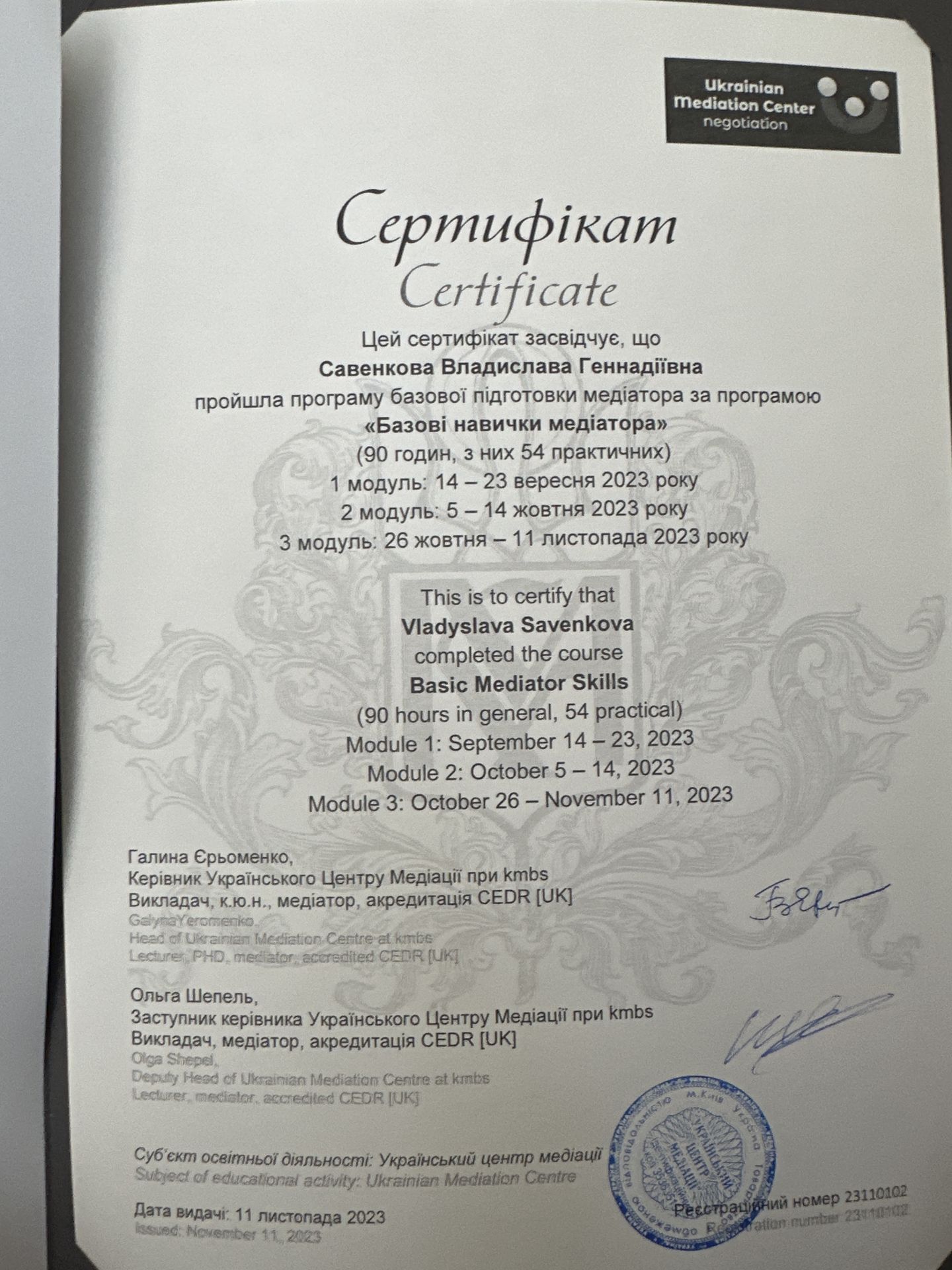 Бізнес медіатор Торгової-промислової палати Мюнхена та Верхньої Баварії, юрист, кандидат юридичних наук, доцент кафедри фінансового права ННІП Київського національного університету імені Тараса Шевченка. Керівник напрямку ADR Адвокатського об'єднання “Аперіо” , бізнес медіатор. Основні спеціалізації: альтернативне врегулювання спорів, бізнес медіація, фасилітація переговорів. Експерт Національного агенства із забезпечення якості освіти. Член Союзу юристів та Асоціації правників України. Співзасновниця БО БФ "АПЕРІО". Спеціалізація: медіація з однією стороною, предпартнерська медіація, підготовка та супровід переговорів, медіація перед заключенням контракту, бізнес медіація (господарські спори, поділ майна та активів, медіація у сфері освіти та ін.) Завершивши курс Базової підготовки медіатора наразі продовжую навчання на Бізнес програмі від Мюнхенської ТПП. Вірю в розвиток та застосування альтернативного вирішення конфліктів. Бажаю мати доступ до розвиток навичок, актуальних практик, підтримки професійної спільноти та обміну досвідом.