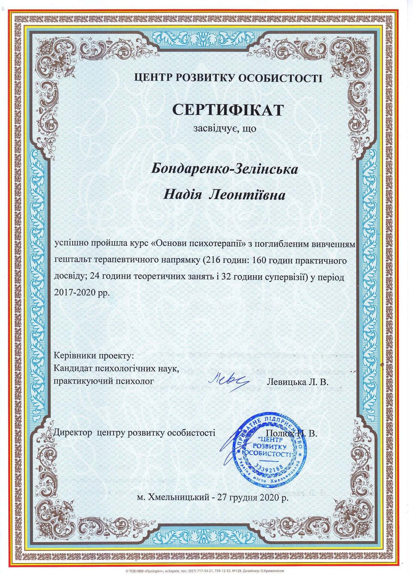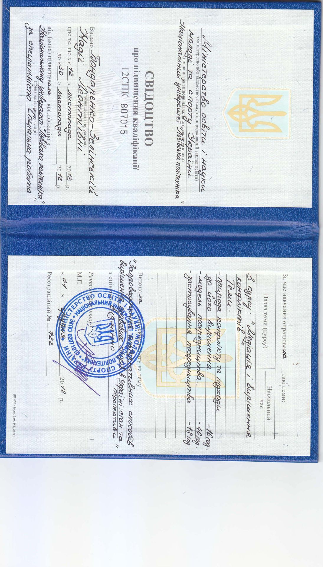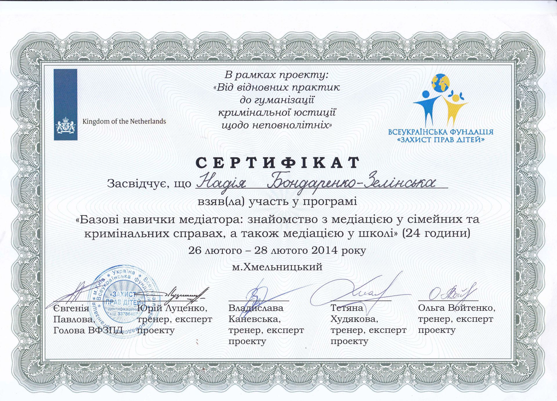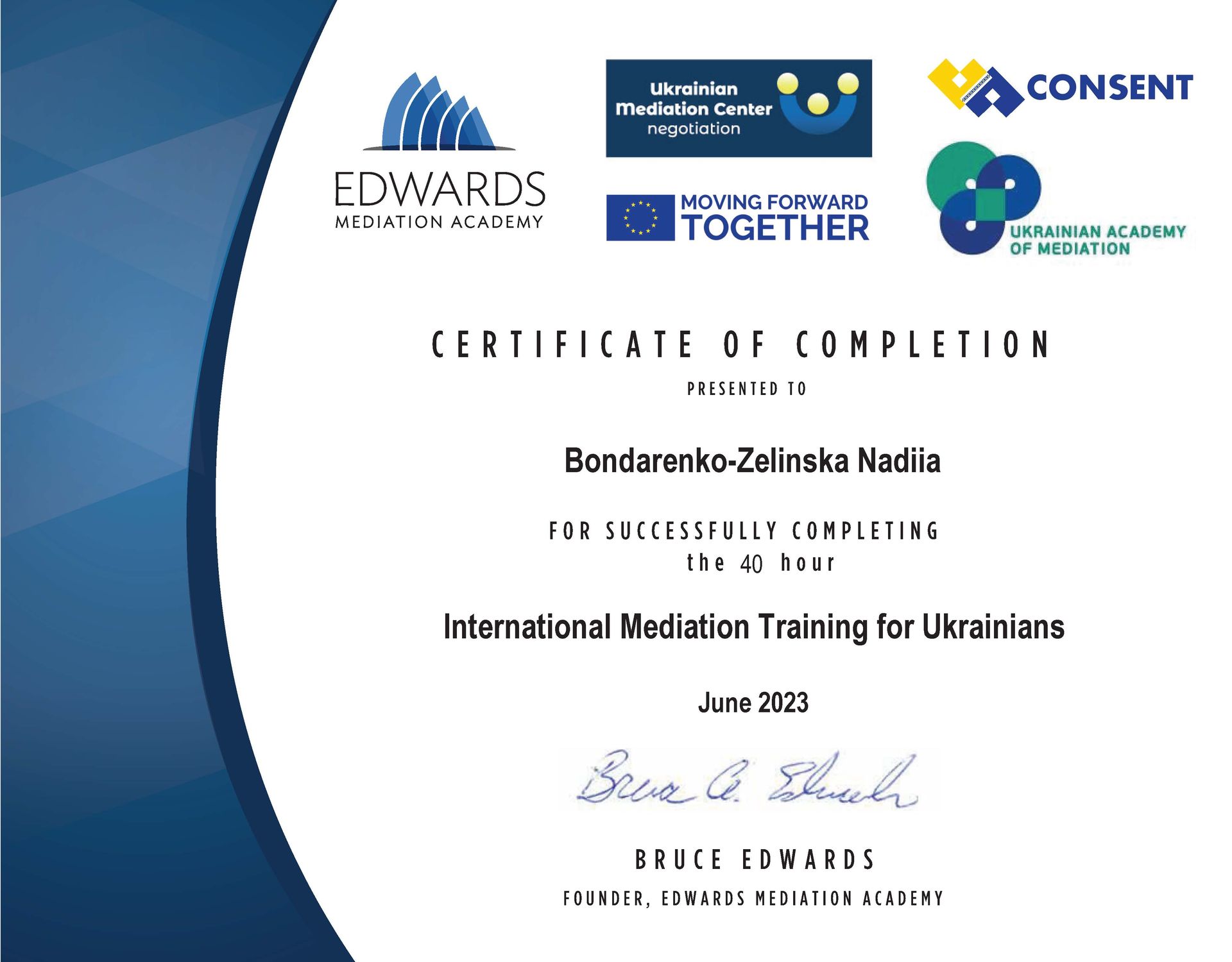 Я - юрист, викладач, медіатор. Практикую АВС з 2013 року в цивільних (переважно в сімейних та спадкових спорах) в трудових та комерційних спорах. Викладаю відповідну навчальну дисципліну в Хмельницькому університеті імені Леоніда Юзькова з 2014 року. За моєю редакцією в 2017 році було видано навчальний посібник Вступ до альтернативного вирішення спорів: навч. посіб. / Г.В. Анікіна, Ю.В. Білоусов, Н.Л. Бондаренко-Зелінська та ін.; під ред. У. Хелльманна, Н.Л. Бондаренко-Зелінська. Хм-й: ХУУП, 2017. 234 с. Бондаренко-Зелінська Надія Леонтіївна