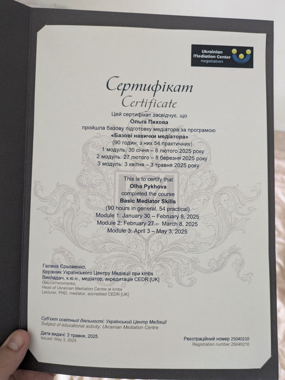 Практик ненасильницького спілкування, сертифікована медіаторка. Сфери роботи: -проведення медіацій -підготовка до переговорів та складних розмов -проведення тренінгів для підлітків та дорослих із практичного застосування ненасильницької комунікації. Я дуже вмотивована розвиватись у напрямку медіації та популяризації медіації. У навчання медіації я прийшла із сфери ненасильницького спілкування, тому можу збагатити простір цими навичками і навчанням з цієї сфери. Я би хотіла глибше зануритись у сферу медіації та бути корисною НАМУ!